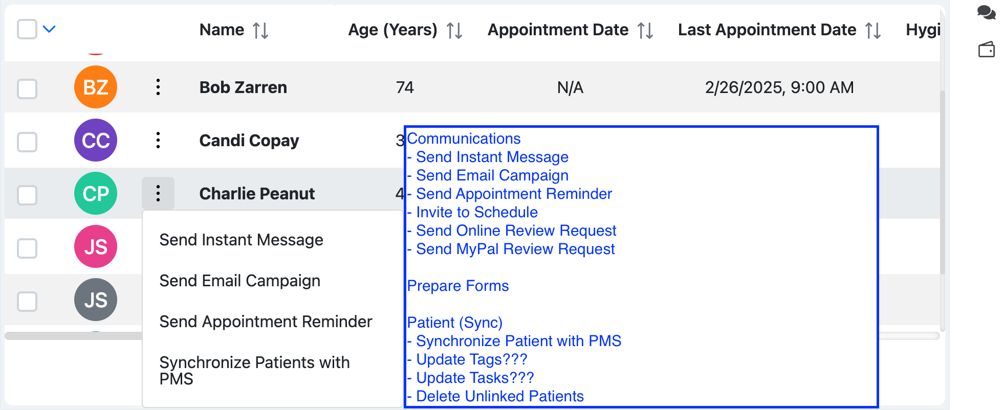 Link Three Dot Actions to appropriate templates, functions, screens, etc...