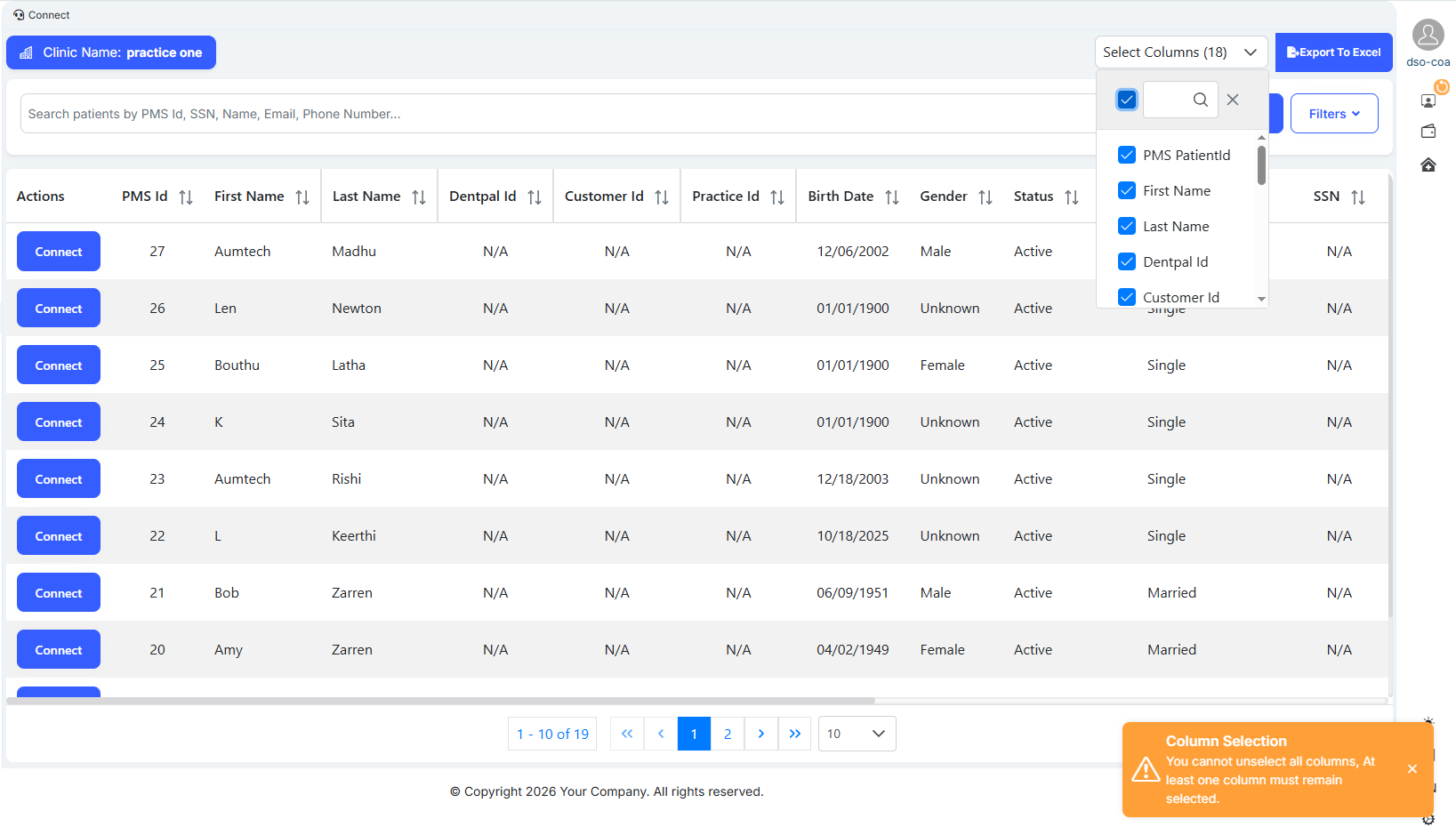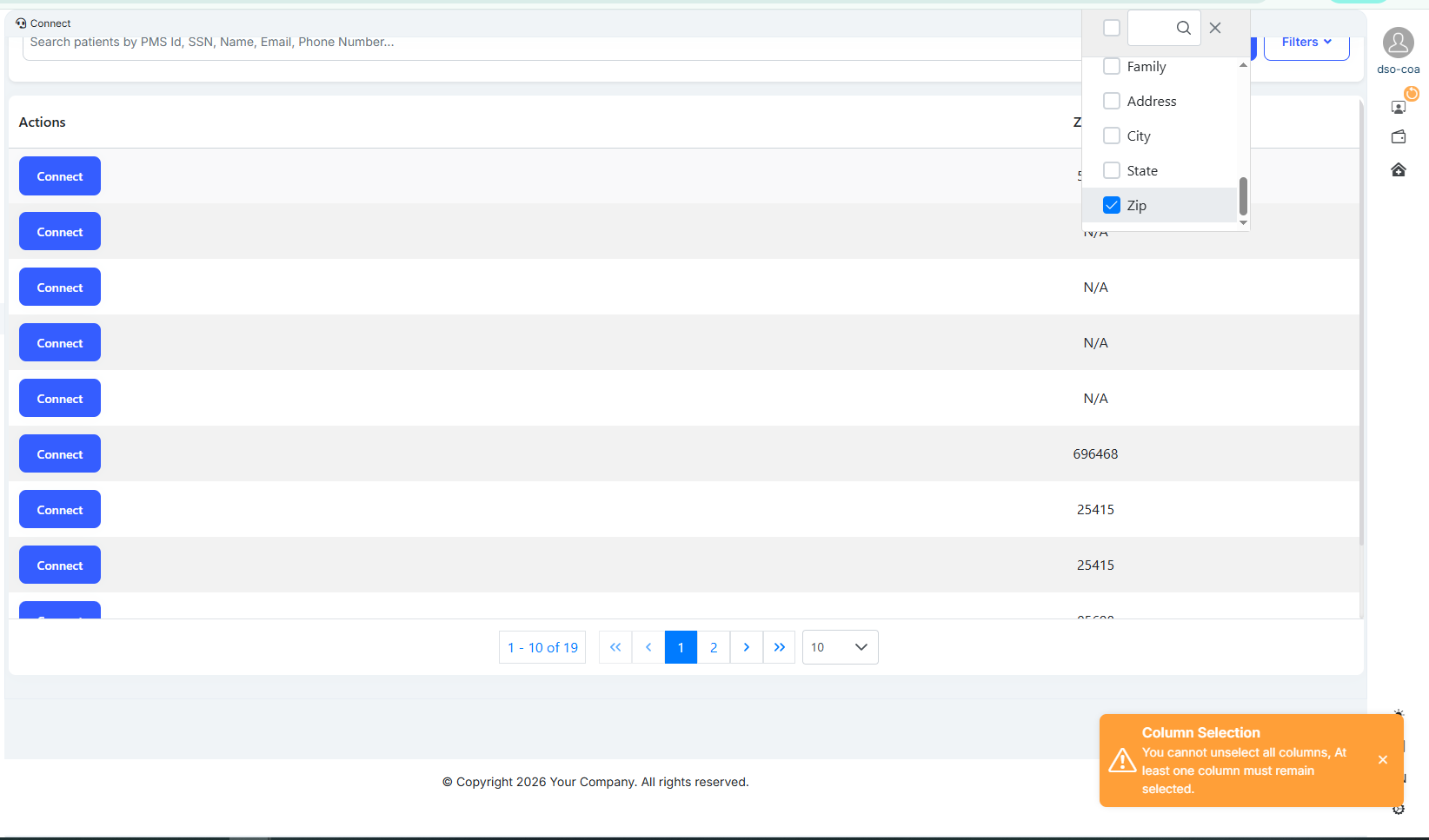 Login as a Company Admin → Go to Connect → Uncheck all options in the Select Column dropdown → The Connect page becomes blank instead of showing an appropriate message.