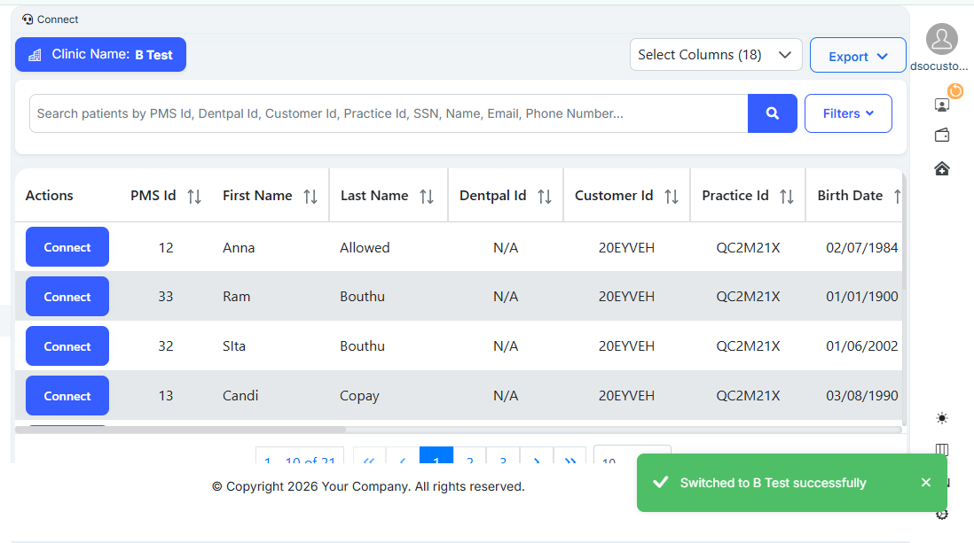 Login as a Company Admin → Go to the Connect module → Switch to another clinic successfully → Try to open Switch Clinic again → It is not opening.