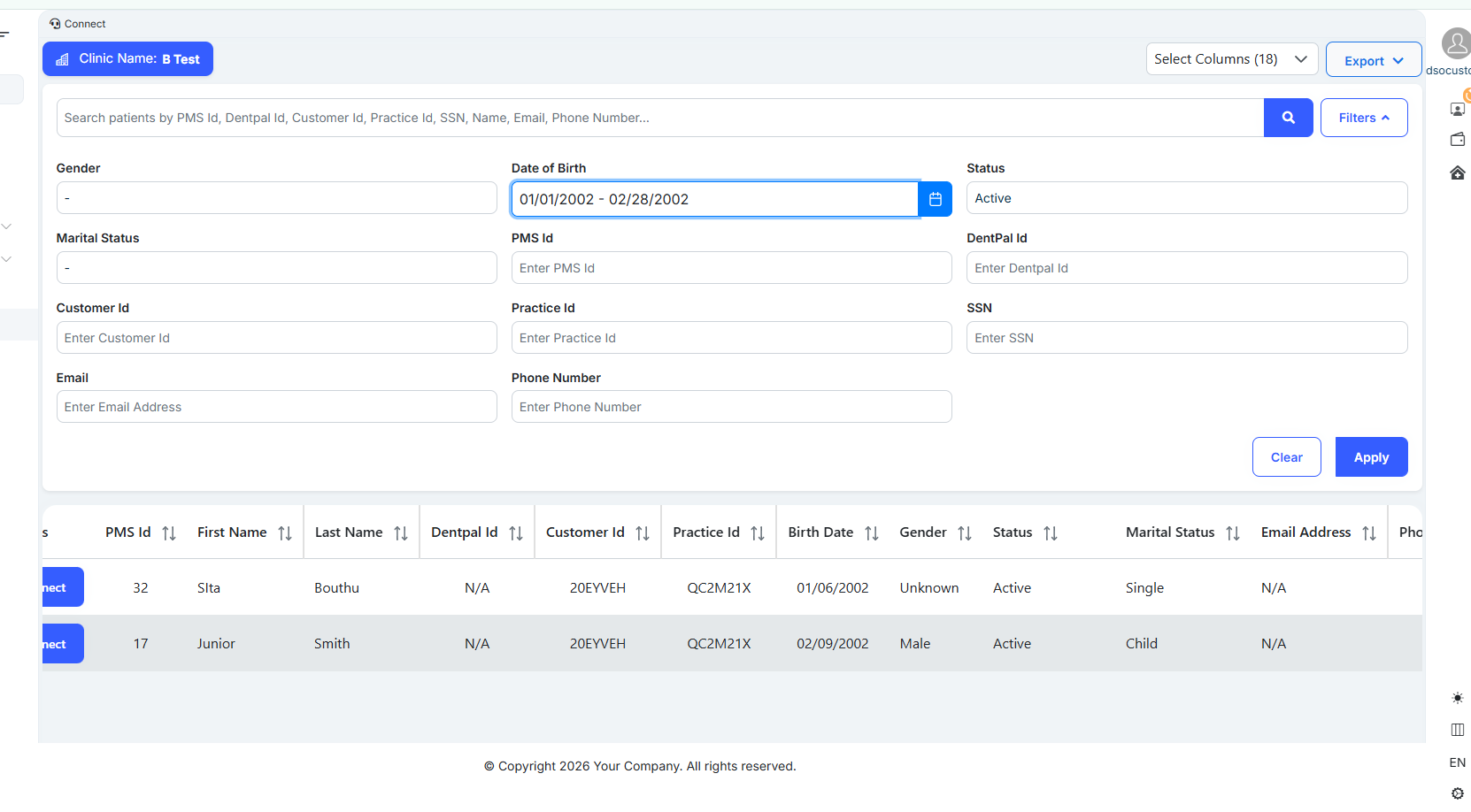 Login as a Company Admin → Go to the Connect module → Click on Filters → The Date of Birth filter is not working.
