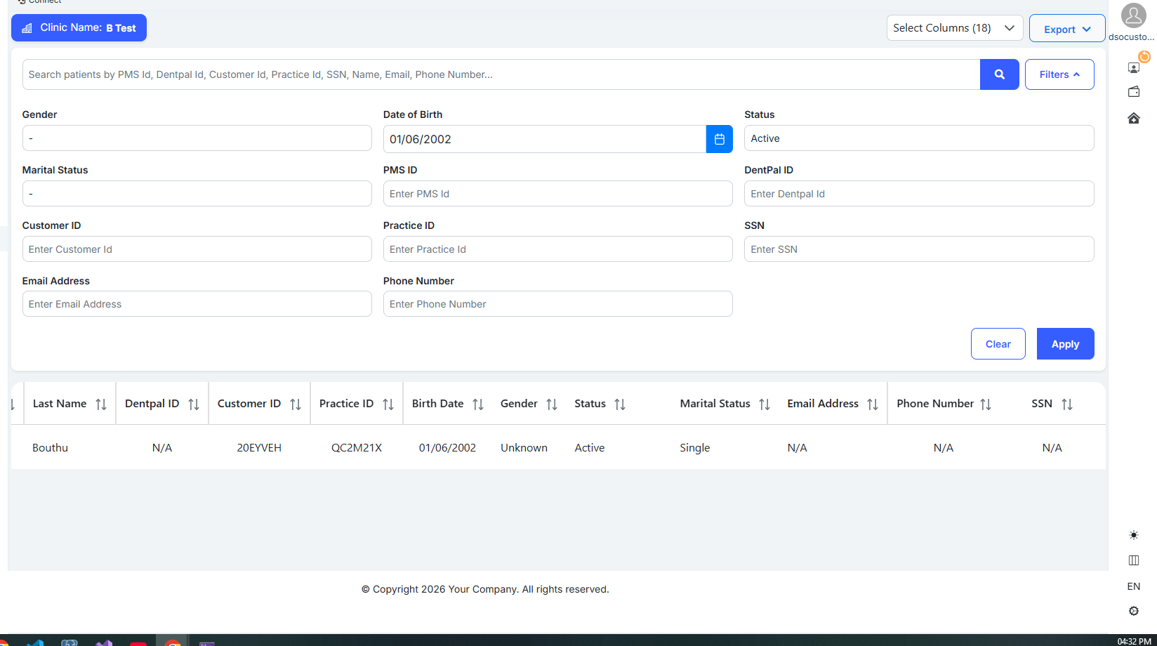 The Date of Birth filter should work correctly and return matching patient records.