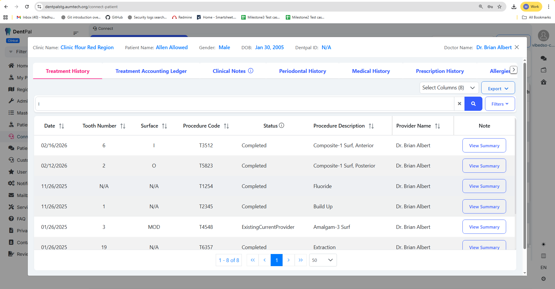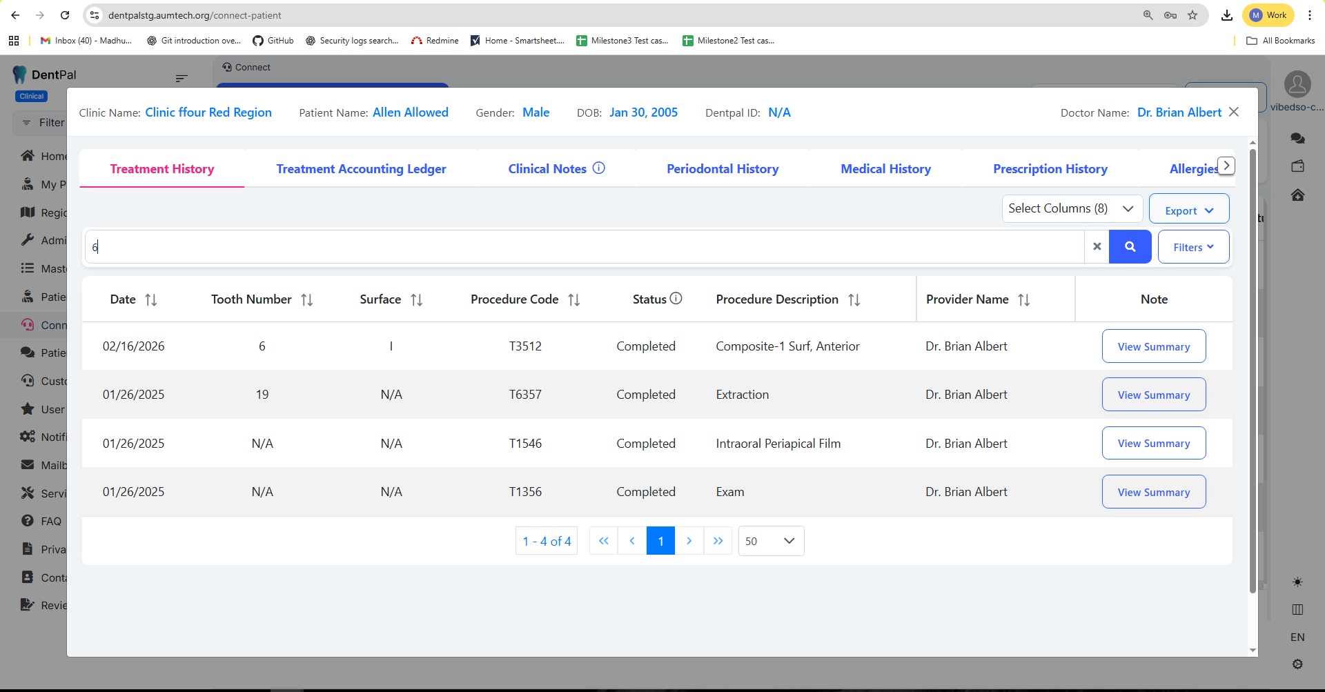 When a user enters Tooth Number or Surface in the Treatment History search fields, the system should filter and display matching treatment records correctly.