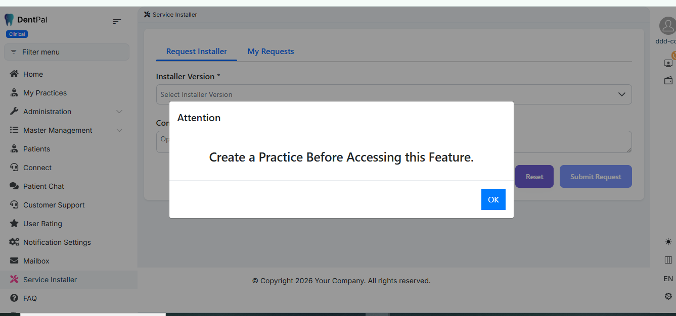 Logged in as Company Admin → The customer currently has no practices created.
