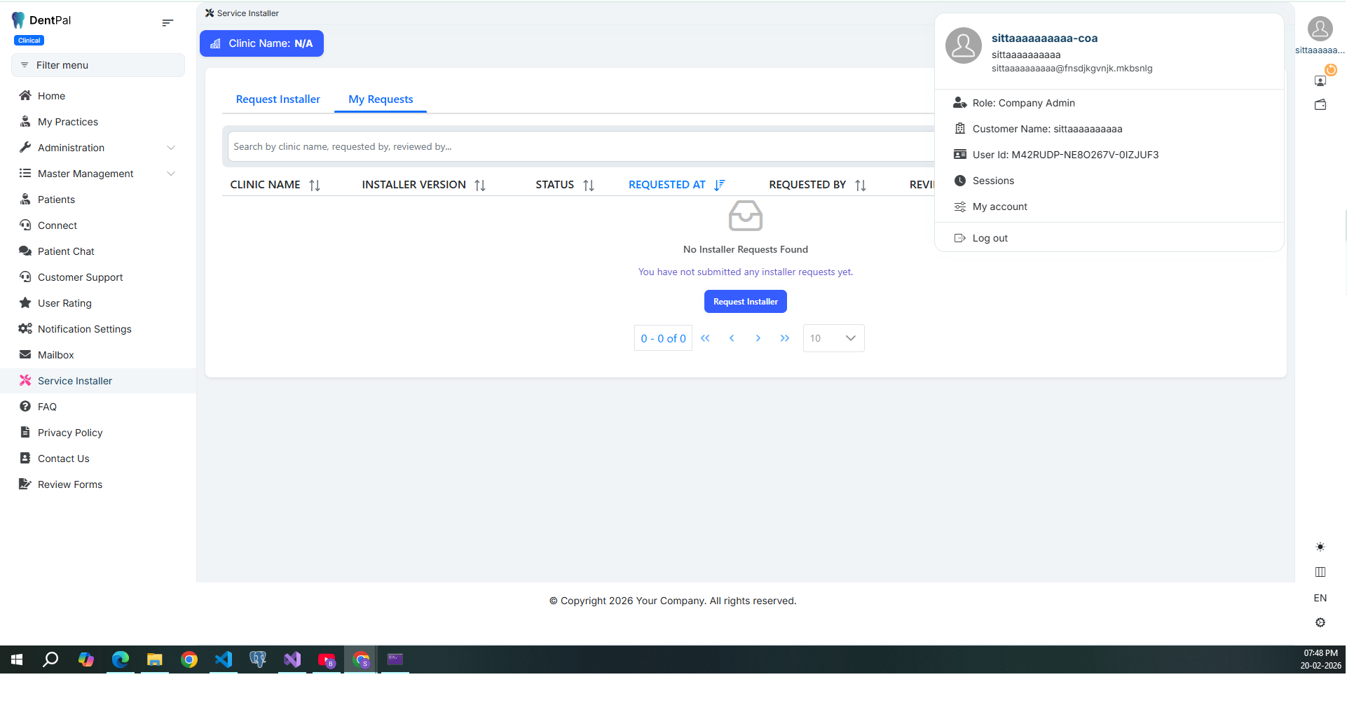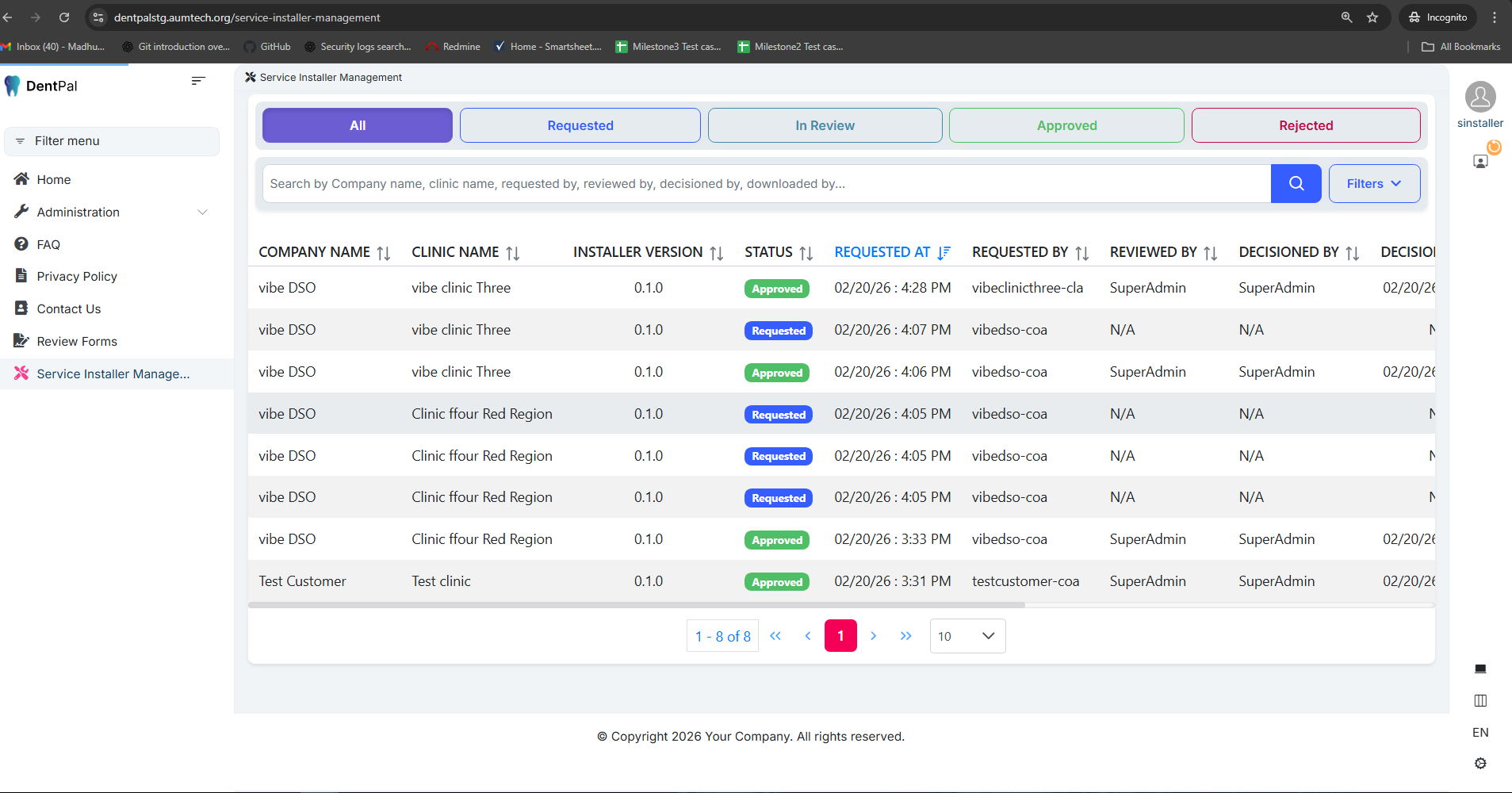 The Service Installer Management menu is visible for this user.