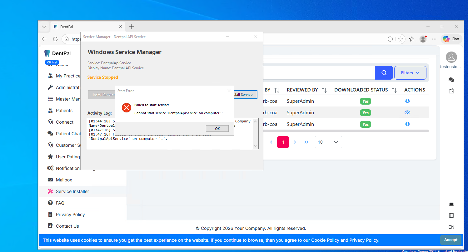 When starting the Dentpal API Service for the first time, the following error is displayed: